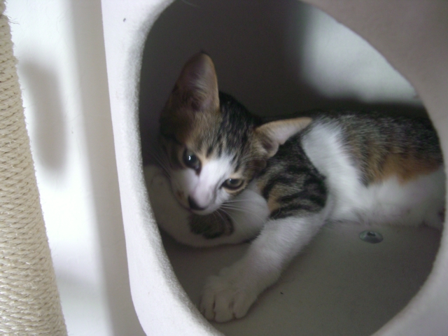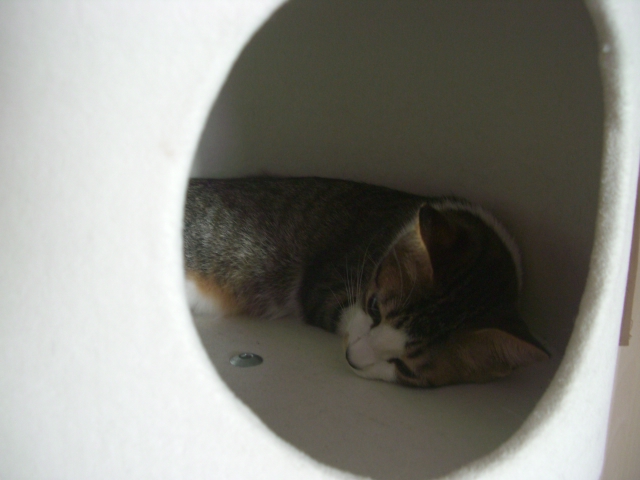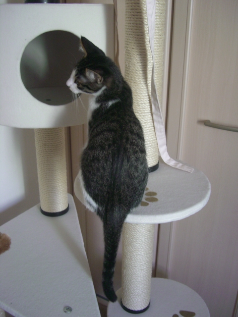 キャットタワー(大)…最初全然登ってくれなくて、しかも登るのが難しいのかよく落ちそうになったりしていたのですが、今ではすっかり器用に上まで登ってくれます。でもやっぱり手前の慣れた小さいネコタワーのほうがお気に入り。